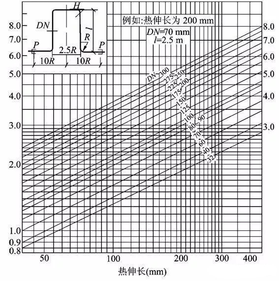 為簡(jiǎn)化計(jì)算,常用線算圖來(lái)確定L型補(bǔ)償器的短臂長(zhǎng)度和Z型補(bǔ)償器的中間臂長(zhǎng)度。圖二(1)是L型彎管段自然補(bǔ)償線算圖,(2)是Z型彎管段自然補(bǔ)償線算圖。